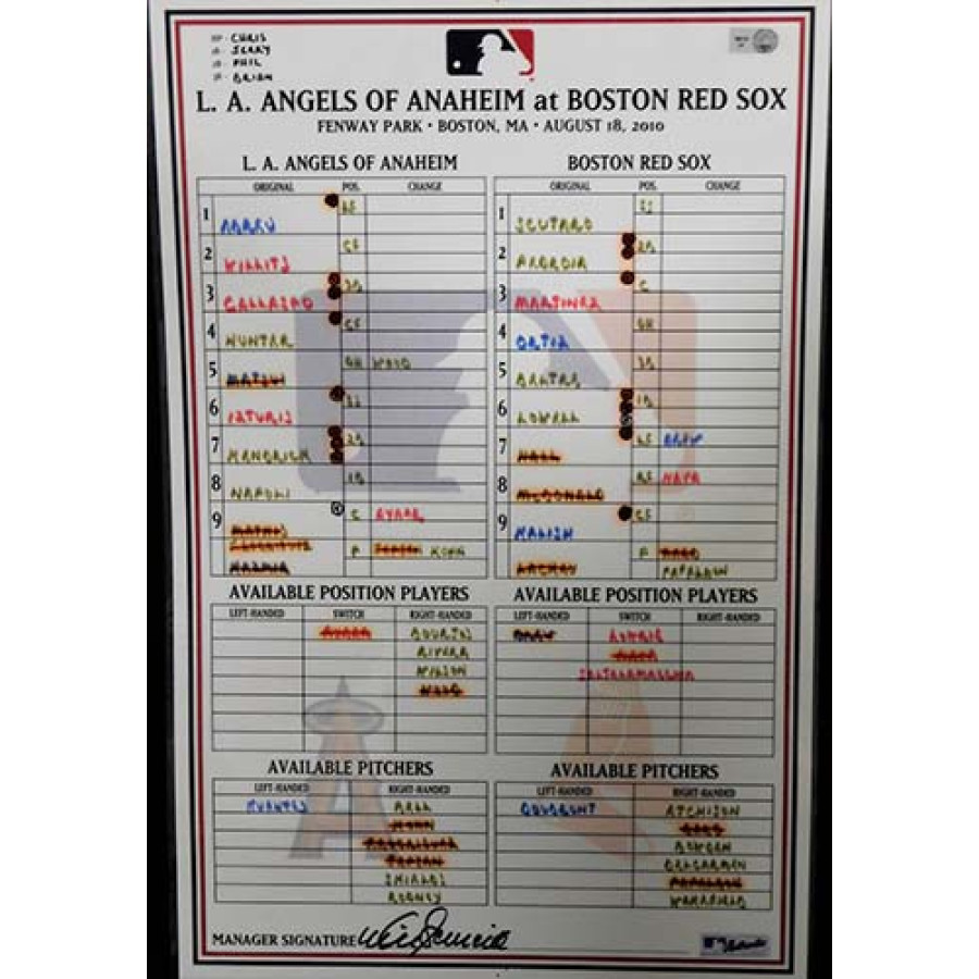 Signed Mike Scioscia Los Angeles Angels Game Used Lineup Card in black sharpie. The card is from Los Angeles Angels Vs. Boston Red Sox August 18, 2010. This has been laminated and does have a pinhole in the center top and bottom of it. The card measures about 11x17 inches. This item has been certified by Major League Baseball (MLB) and will come with a sticker on the item.