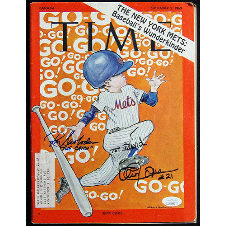 Signed New York Mets Ron Swoboda and Amos Otis September 5, 1969 Time Magazine Canada in black and blue sharpie on the cover. The Amos signature is personalized "To David". The magazine front and back cover has separated from the rest of the magazine binding. It also has some wear and tear. This item has been certified by James Spence Authentication (JSA) and will come with a sticker on the item and matching card.