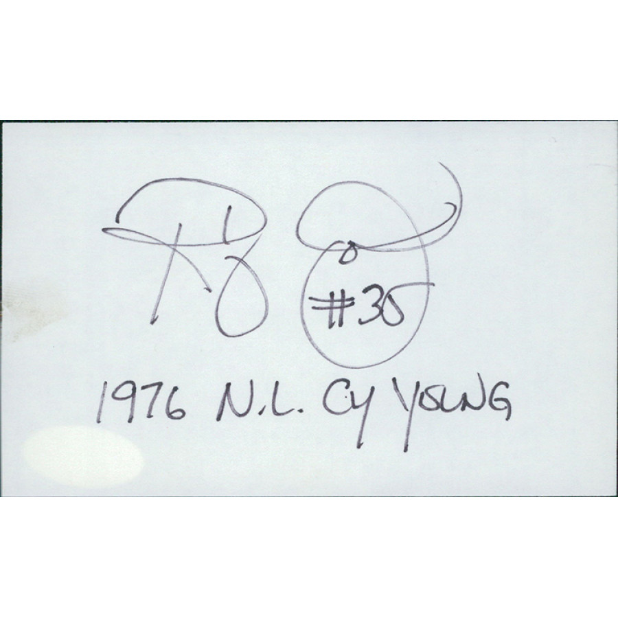 Signed Randy Jones 3x5 Index Card in black ink with "1976 N.L. CY Young". There is some staining on the left side of the index card. This item has been certified by James Spence Authentication (JSA) with sticker affixed to item and matching card.