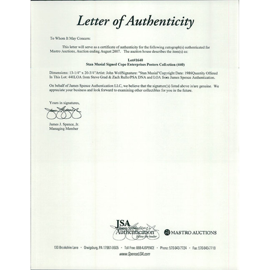 Signed Stan Musial St. Louis Cardinals 13x21 Cope Enterprise poster in blue ink. The poster has some light kinks and creases. This item has been certified by James Spence Authentication (JSA) and will come with a sticker on the item and matching card. This also includes auctions letter from both James Spence Authentication (JSA) and Professional Sports Authenticators (PSA).
