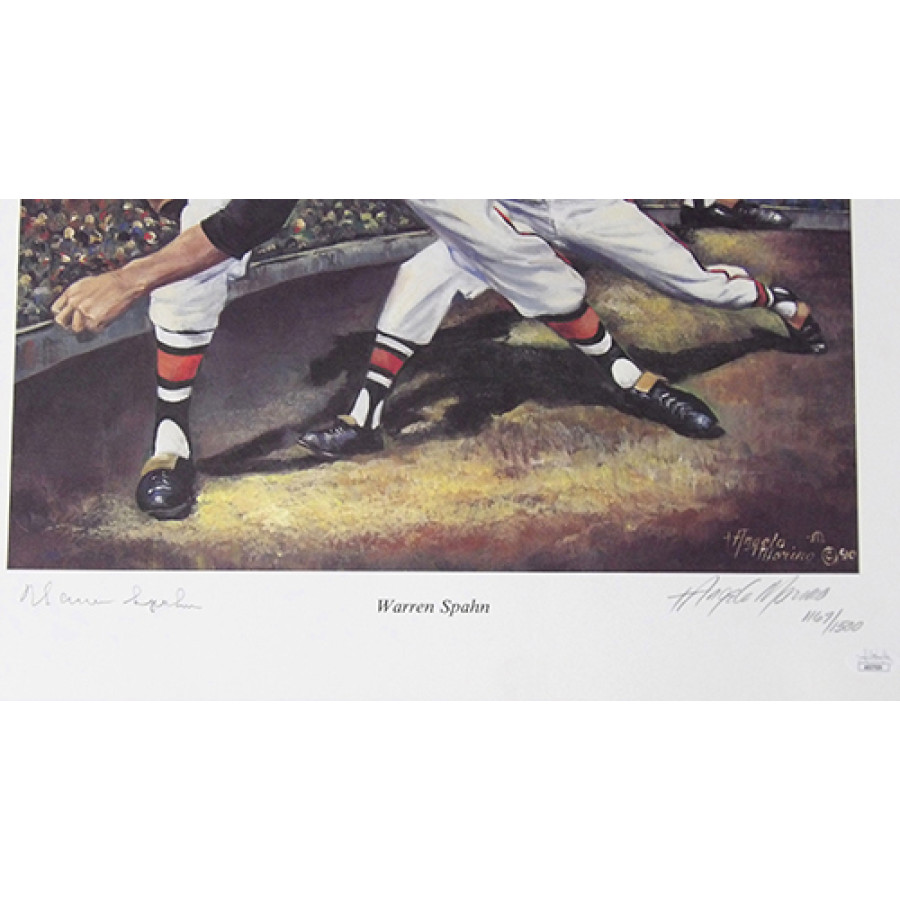 Signed Warren Spahn Boston Braves 18x24 limited edition lithograph in pencil. This is numbered 1167 of 1500. This is also signed by the artist Christopher Paluso. The litho does have some light dirt marks and wearing. This item is certified by James Spence Authentication (JSA) with sticker affixed to item and matching card.