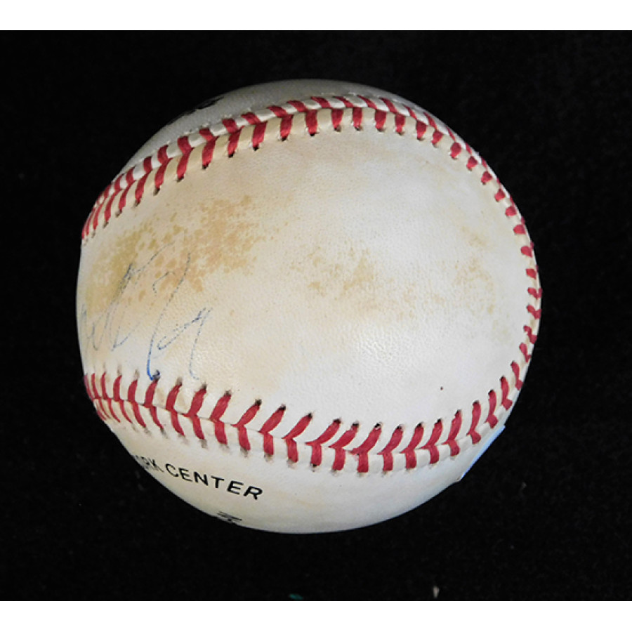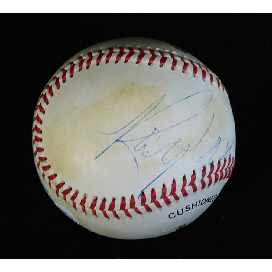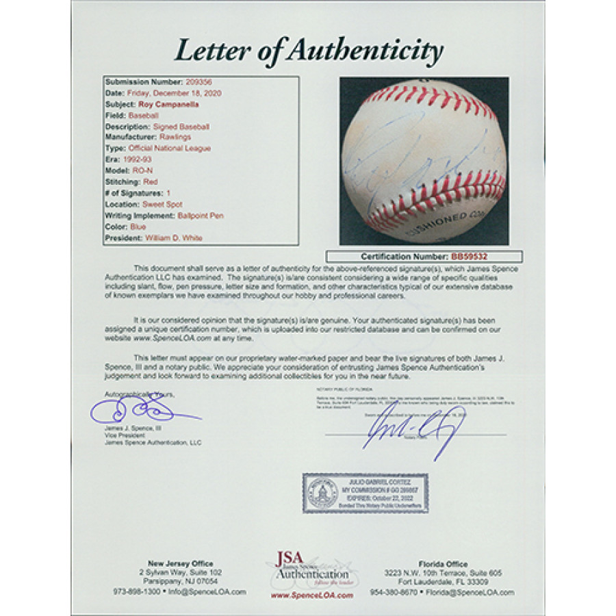 Signed Roy Campanella Rawlings Official National League Baseball in blue pen. The ball is toned and signature is light. This item has been certified by James Spence Authentication (JSA) with sticker affixed to item and matching letter.