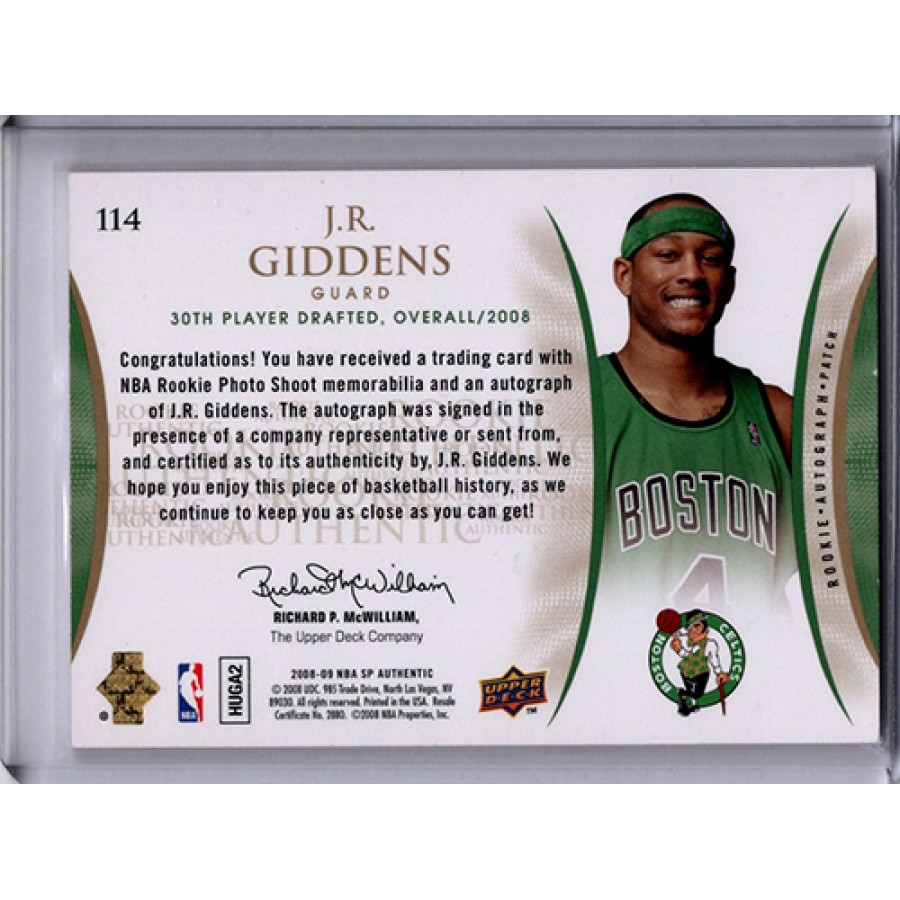 J.R. Giddens Boston Celtics 2008-09 Upper Deck SP Authentic Autographed Patch Basketball Card #114. This is numbered 238 of 499.