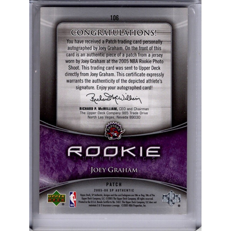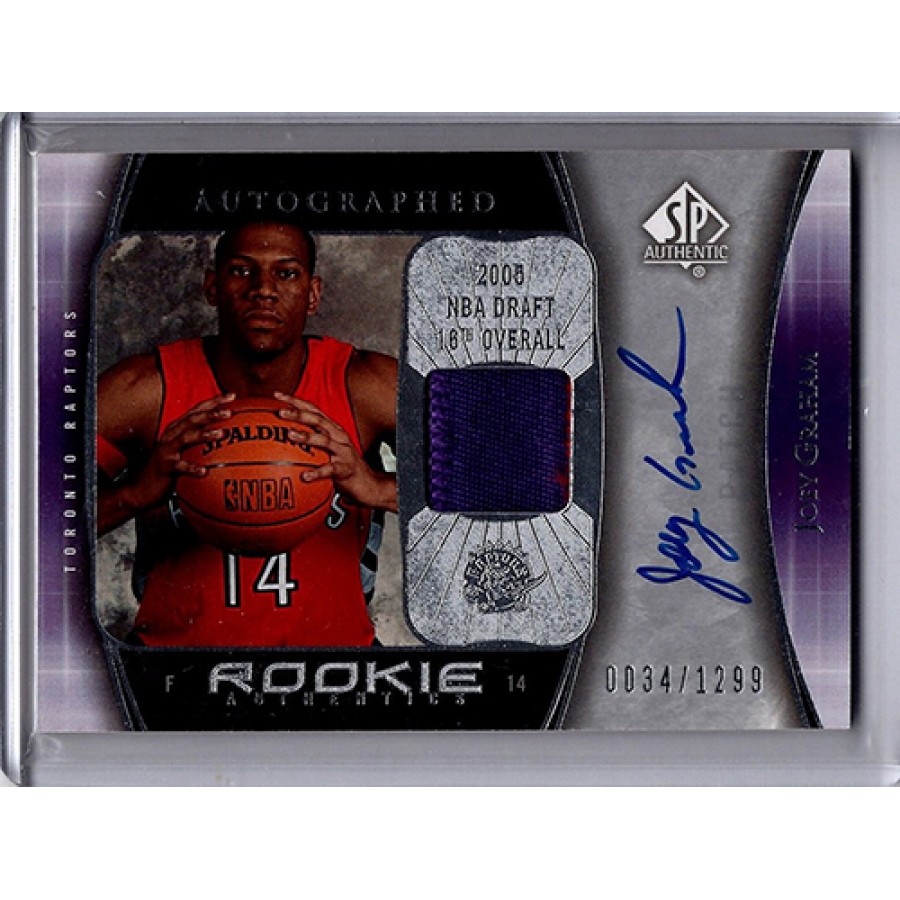 Joey Graham Toronto Raptors 2005-06 Upper Deck SP Authentic Rookie Authentics Autographed Patch Basketball Card #106. This is numbered 34 of 1299.