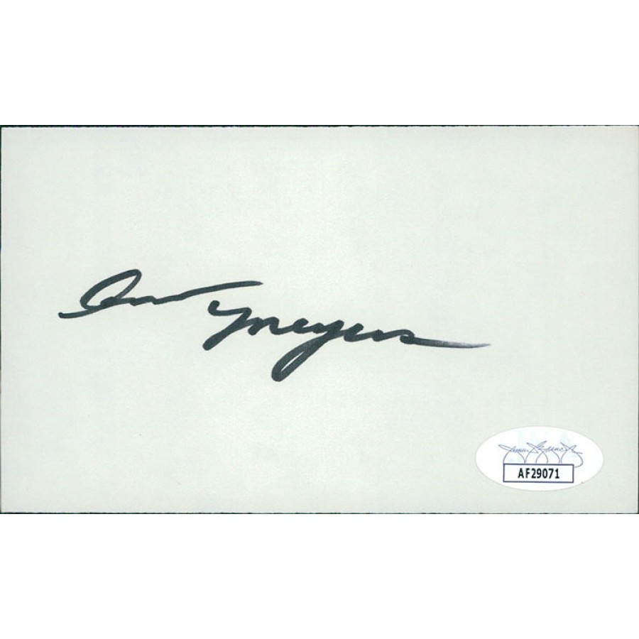 Signed Ann Meyers 3x5 Index Card in black sharpie. This item has been certified by James Spence Authentication (JSA) with sticker on item and matching card.