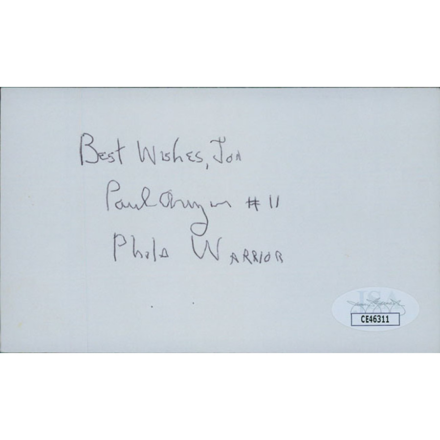 Signed Paul Arizin 3x5 index card in black ink. This item has been certified by James Spence Authentication (JSA) with sticker on item and matching card.