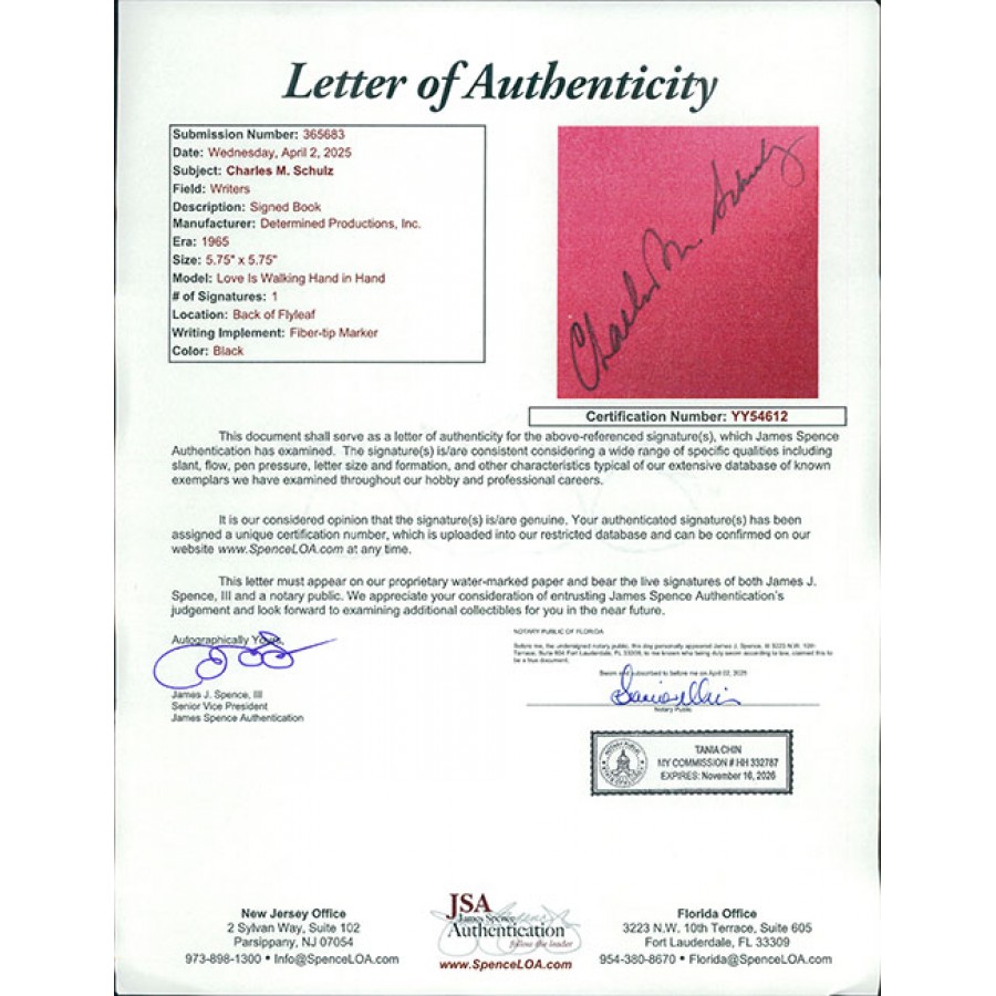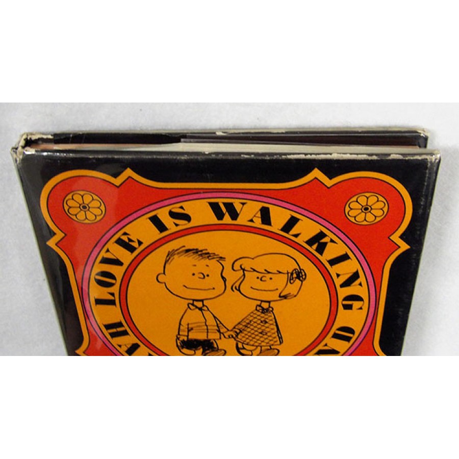 Signed Charles Schulz Live is Walking Hand In Hand hardcover book in black ink on the inside cover page. The books has scuffing and the binding has wearing to it. This item has been certified by James Spence Authentication (JSA) with sticker affixed to item and matching card.