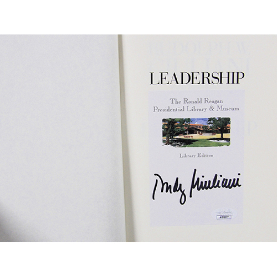 Signed Rudy Giuliani Leadership first edition hardcover book in black ink on the inside cover booklet page. This item has been certified by James Spence Authentication (JSA) with sticker affixed to item and matching card.