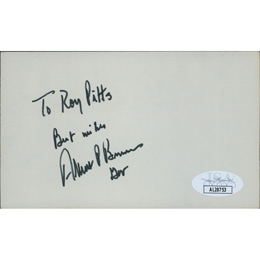 Signed Albert Brewer 3x5 index card in black ink personalized "To Roy Pitts". This item has been certified by James Spence Authentication (JSA) with sticker affixed to item and matching card.