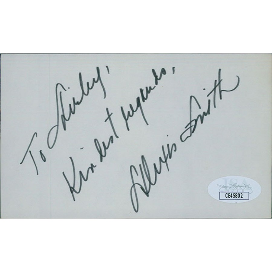 Signed Alexis Smith 3x5 index card in black ink personalized "To Shirley". This item has been certified by James Spence Authentication (JSA) with sticker affixed to item and matching card.