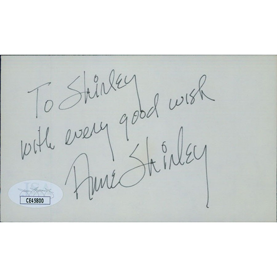 Signed Anne Shirley 3x5 index card in black ink personalized "To Shirley". This item has been certified by James Spence Authentication (JSA) with sticker affixed to item and matching card.