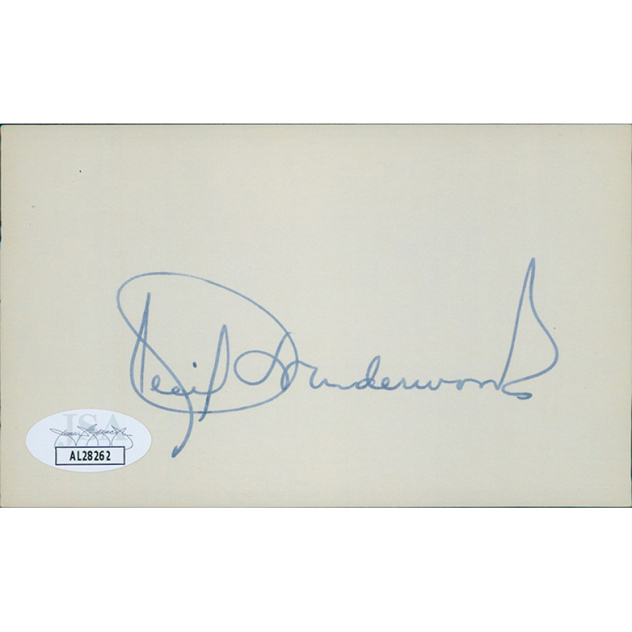 Signed Cecil Underwood 3x5 index card in blue ink. This item has been certified by James Spence Authentication (JSA) with sticker affixed to item and matching card.