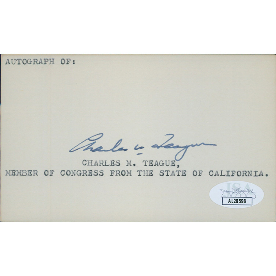 Signed Charles Teague 3x5 index card in black ink. This item has been certified by James Spence Authentication (JSA) with sticker affixed to item and matching card.