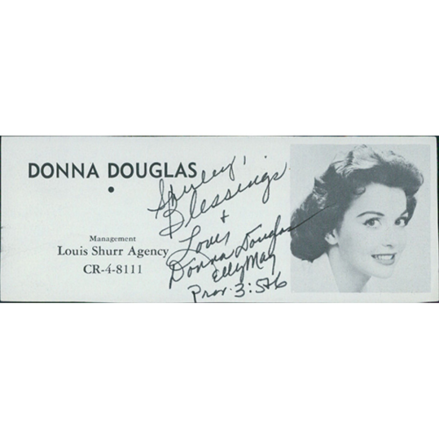 Signed Donna Douglas 2x5 Directory Cut in black ink. This item has been certified by James Spence Authentication (JSA) with sticker affixed to item and matching card.