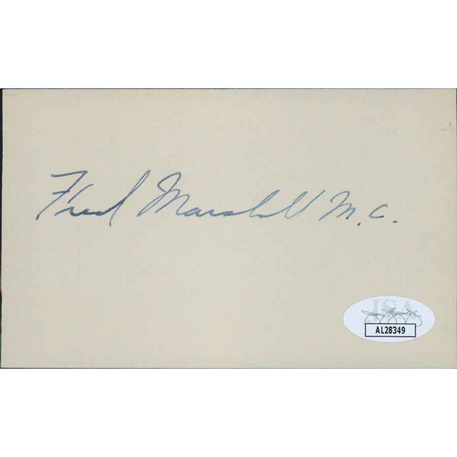 Signed Fred Marshall 3x5 index card in blue ink. This item has been certified by James Spence Authentication (JSA) with sticker affixed to item and matching card.