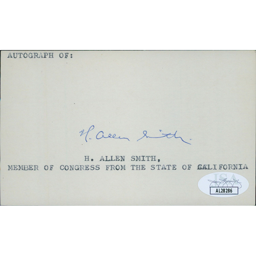 Signed H. Allen Smith 3x5 index card in blue ink. This item has been certified by James Spence Authentication (JSA) with sticker affixed to item and matching card.