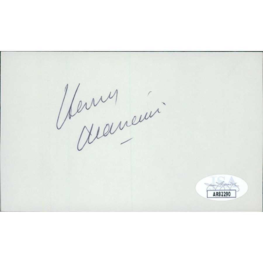 Signed Henry Mancini 3x5 index card in black ink. This item has been certified by James Spence Authentication (JSA) with sticker on item and matching card.