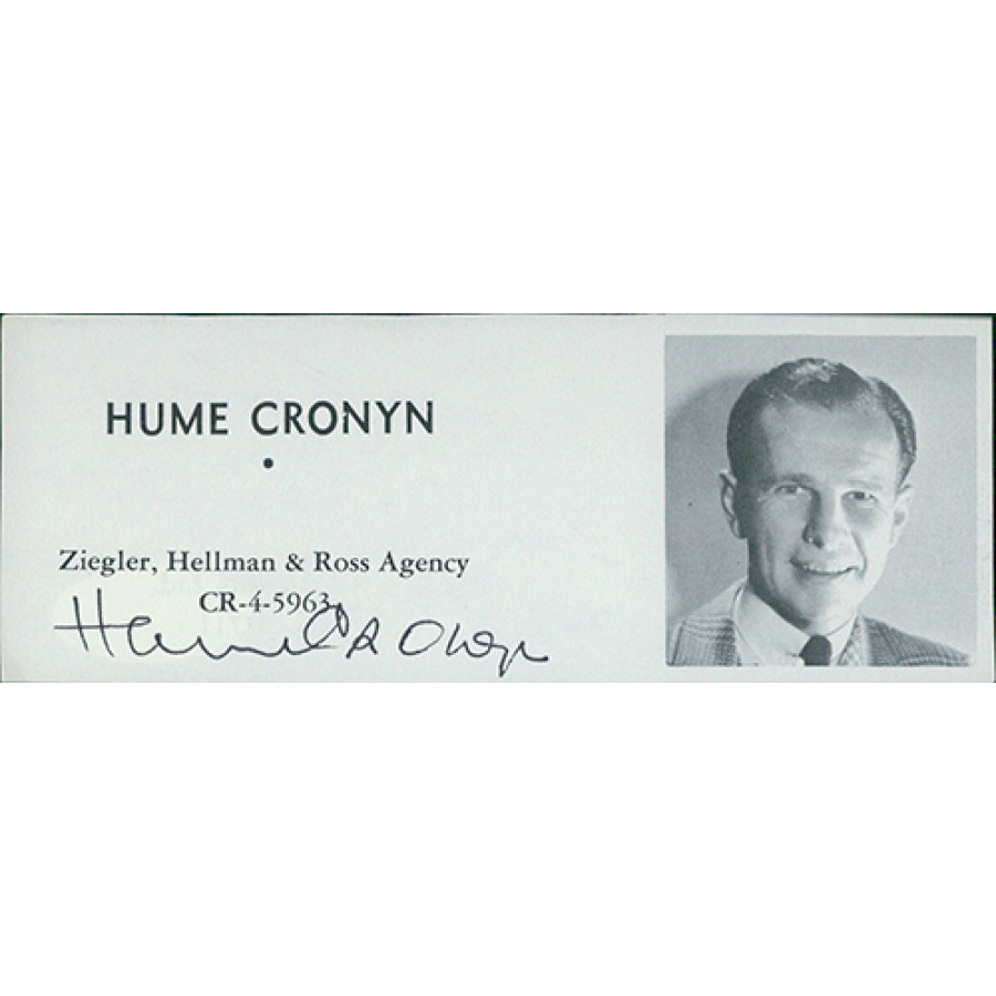 Signed Hume Cronyn 2x5 Directory Cut in black ink. This item has been certified by James Spence Authentication (JSA) with sticker affixed to item and matching card.