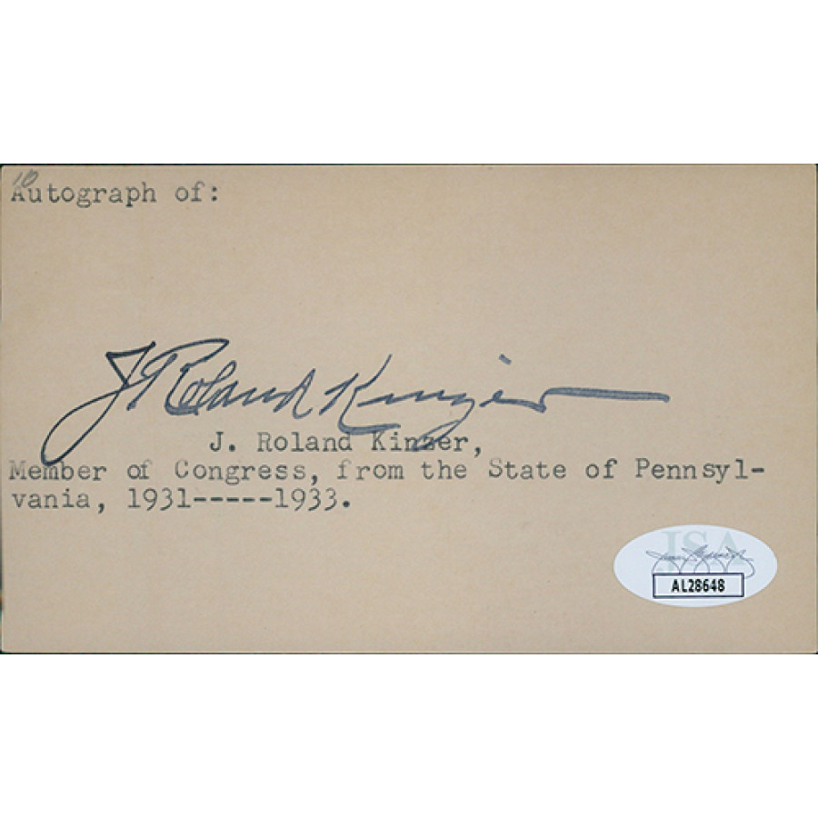 Signed J. Roland Kinzer 3x5 index card in black ink. This item has been certified by James Spence Authentication (JSA) with sticker affixed to item and matching card.