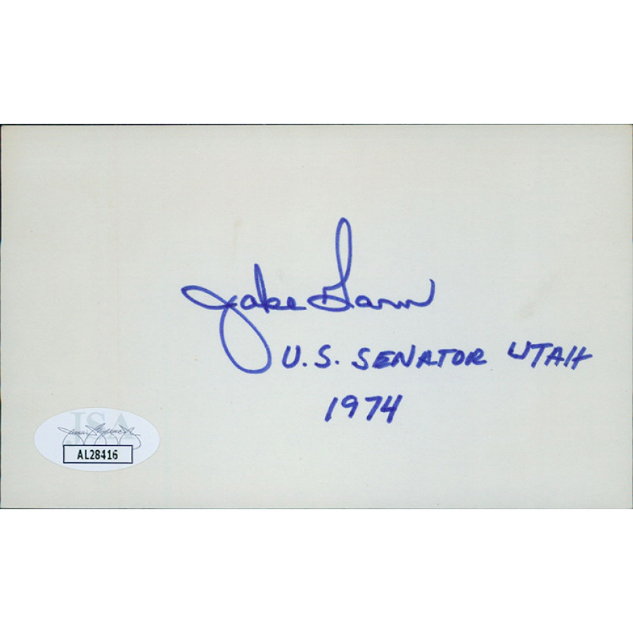 Signed Jake Garn 3x5 index card in blue ink. This item has been certified by James Spence Authentication (JSA) with sticker affixed to item and matching card.