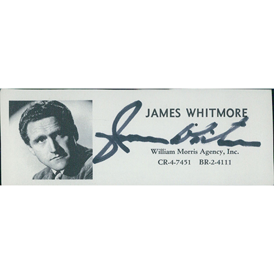 Signed James Whitmore 2x5 Directory Cut in black ink. This item has been certified by James Spence Authentication (JSA) with sticker affixed to item and matching card.