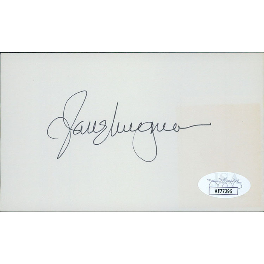 Signed Jane Wyman 3x5 index card in black ink. This item has been certified by James Spence Authentication (JSA) with sticker affixed to item and matching card.