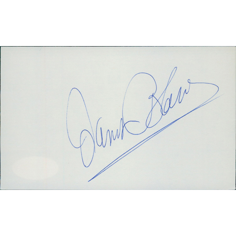 Signed Janet Blair 3x5 index card in blue ink. This item has been certified by James Spence Authentication (JSA) with sticker affixed to item and matching card.