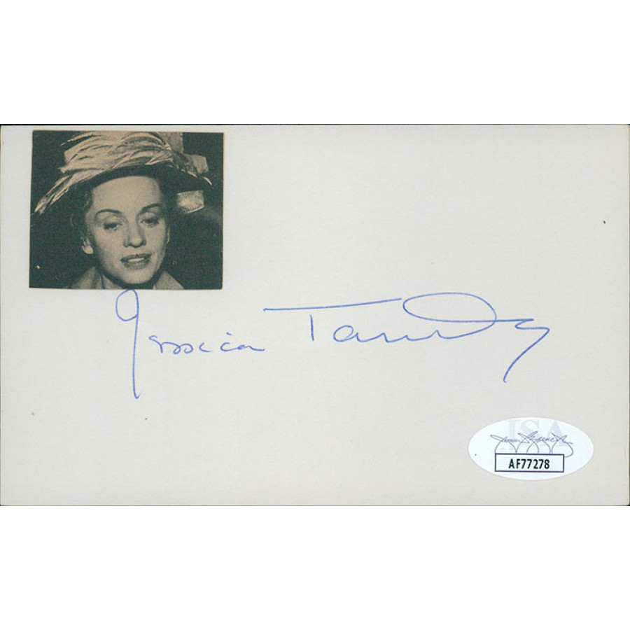 Signed Jessica Tandy 3x5 Index Card in blue pen. The cut photo is attached to the card. This item has been certified by James Spence Authentication (JSA) with sticker on item and matching card.
