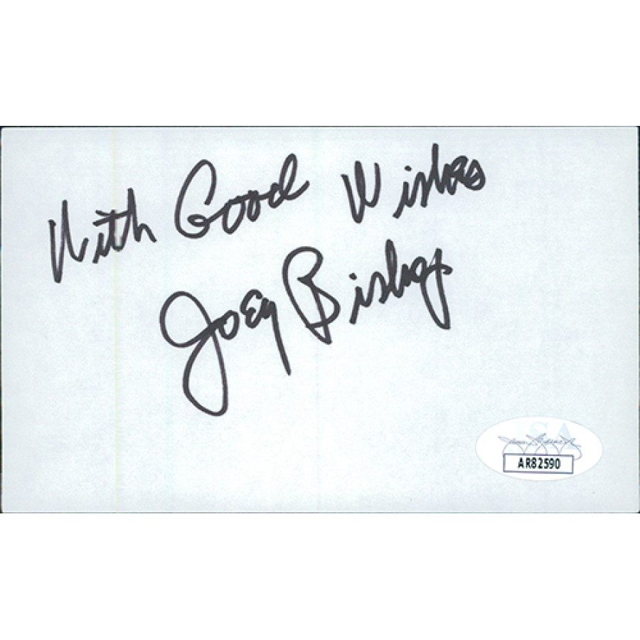 Signed Joey Bishop 3x5 index card in black sharpie. This item has been certified by James Spence Authentication (JSA) with sticker on item and matching card.