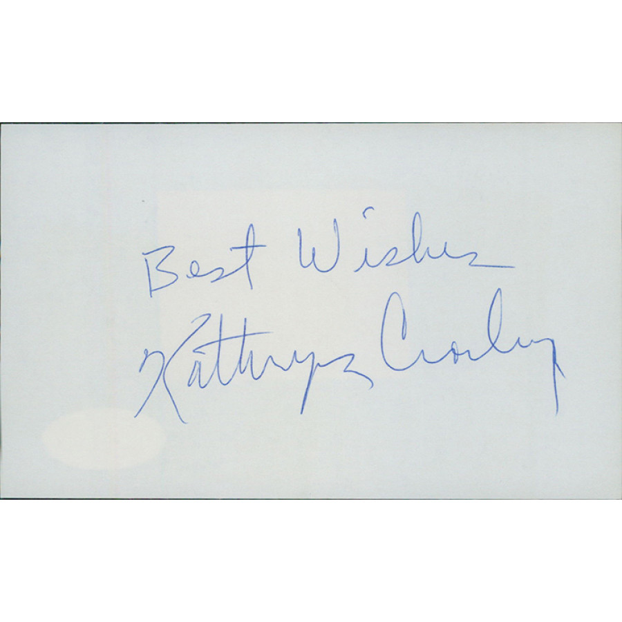 Signed Kathryn Crosby 3x5 index card in blue ink. This item has been certified by James Spence Authentication (JSA) with sticker affixed to item and matching card.