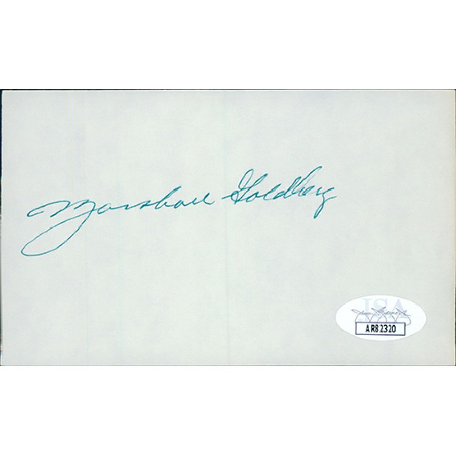 Signed Marshall Goldberg 3x5 Index Card in green ink. This item has been certified by James Spence Authentication (JSA) with sticker on item and matching card.