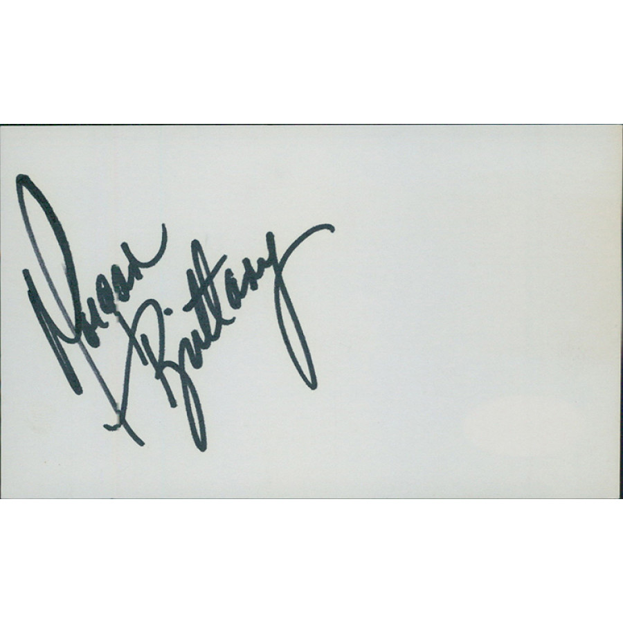 Signed Morgan Brittany 3x5 index card in black sharpie. This item has been certified by James Spence Authentication (JSA) with sticker affixed to item and matching card.