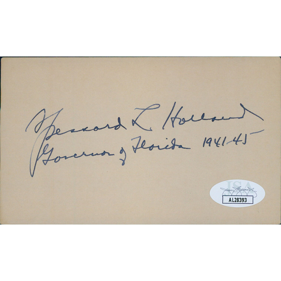 Signed Spessard Holland 3x5 index card in black ink. This item has been certified by James Spence Authentication (JSA) with sticker affixed to item and matching card.