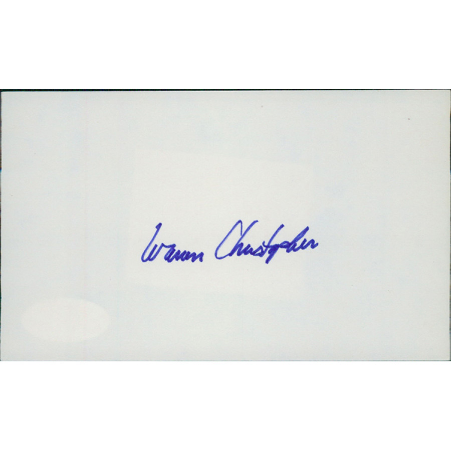 Signed Warren Christopher 3x5 index card in blue sharpie. This item has been certified by James Spence Authentication (JSA) with sticker affixed to item and matching card.