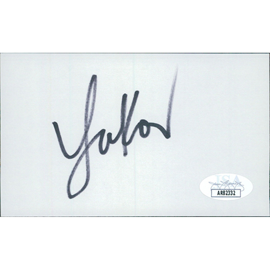 Signed Yakov Smirnoff 3x5 index card in black sharpie. This item has been certified by James Spence Authentication (JSA) with sticker on item and matching card.