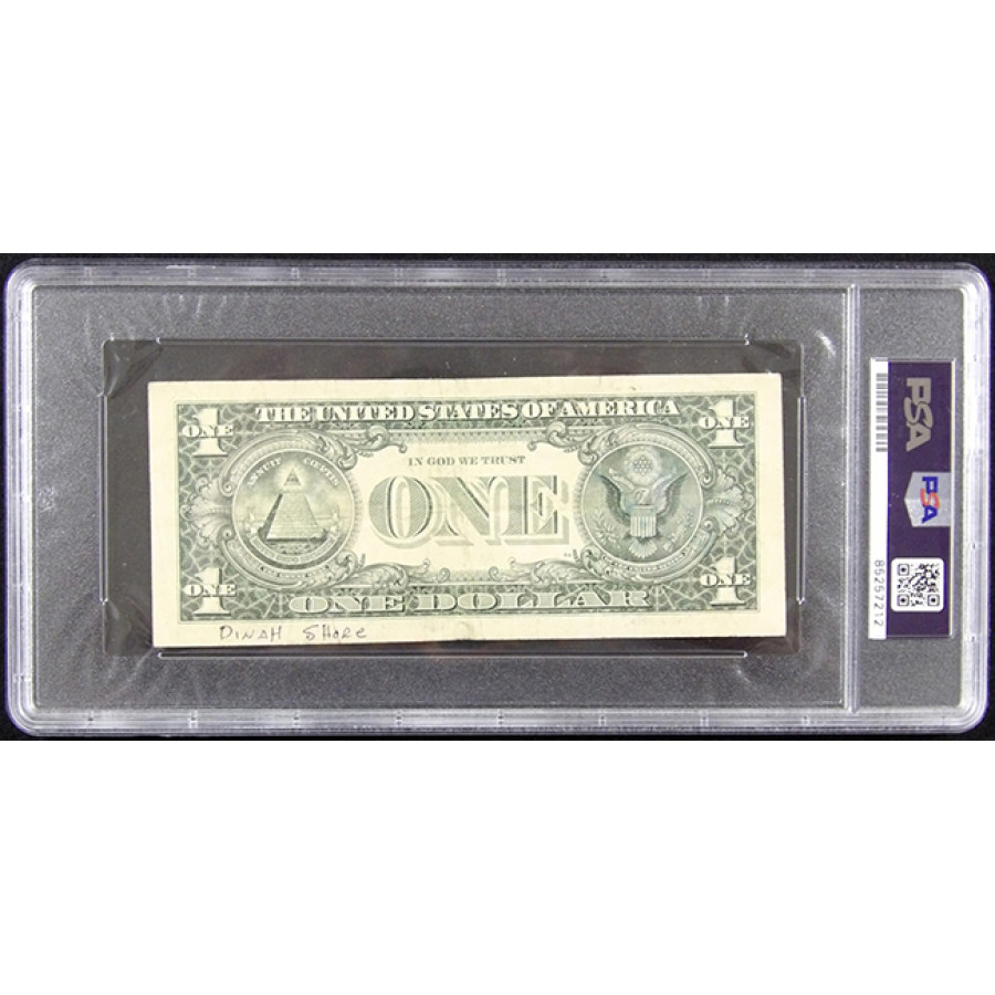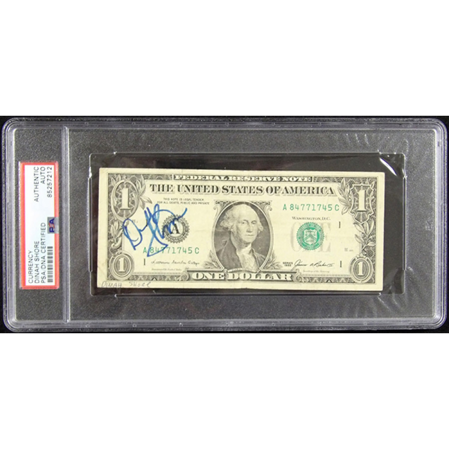 Signed Dinah Shore one dollar bill in blue sharpie. This item has been certified by Professional Sports Authenticator (PSA) encapsulated.