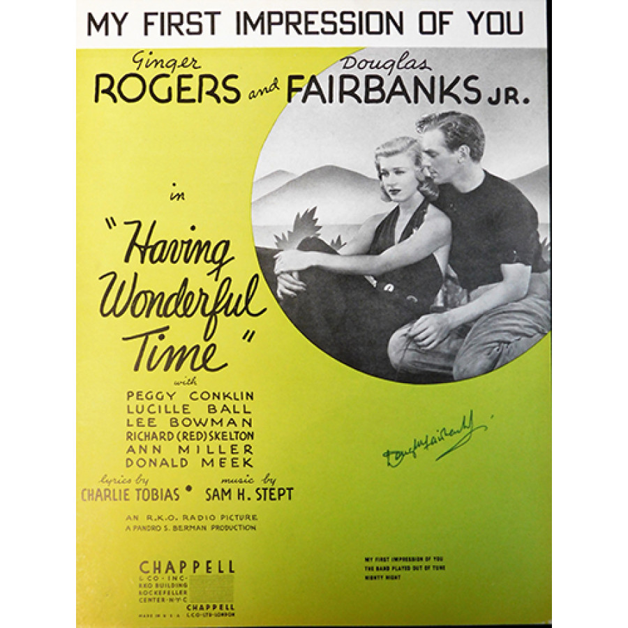 Signed Douglas Fairbanks Jr. My First Impression Of You sheet music in blue ink. This item has been authenticated by James Spence Authentication (JSA) with sticker affixed to item and matching card. This item is in used condition with minor wear and tear.
