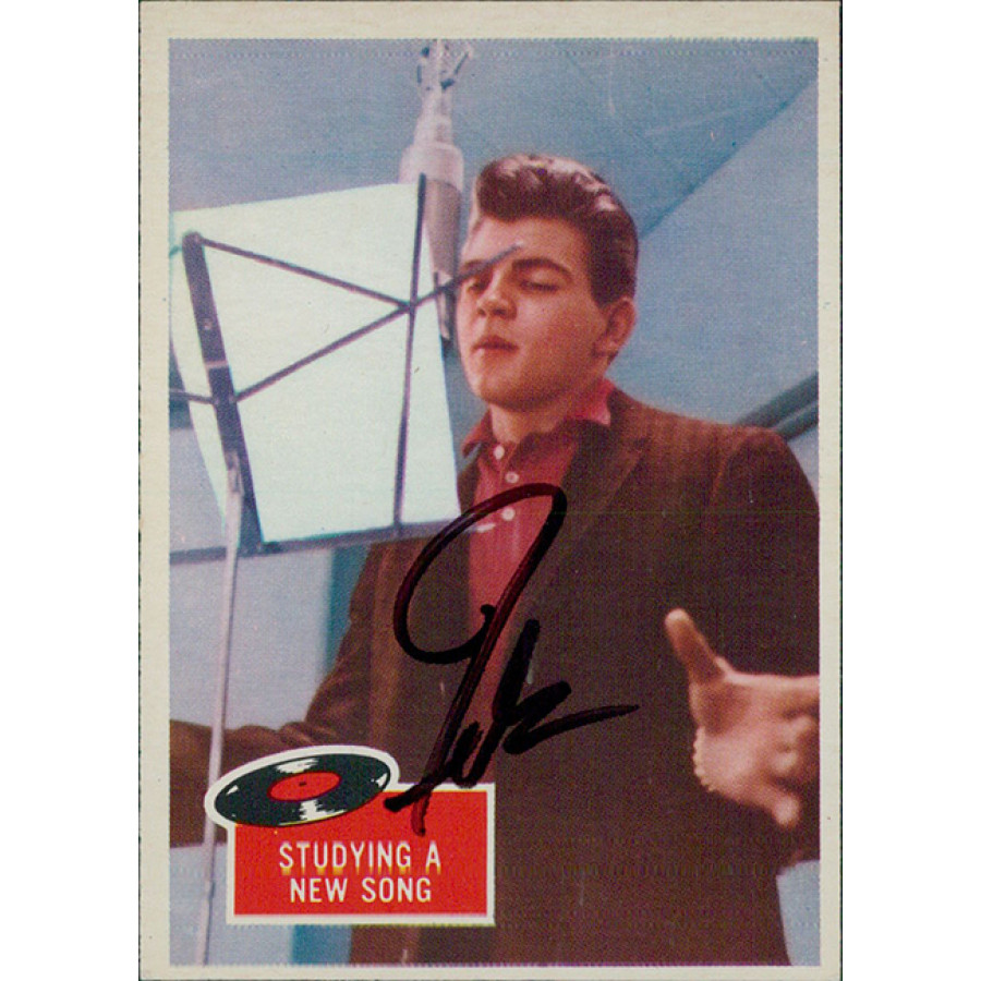Signed Fabian Forte 1959 Topps Studying A New Song card #54 in black ink. This item is certified by James Spence Authentication (JSA) with sticker affixed to item and matching card.