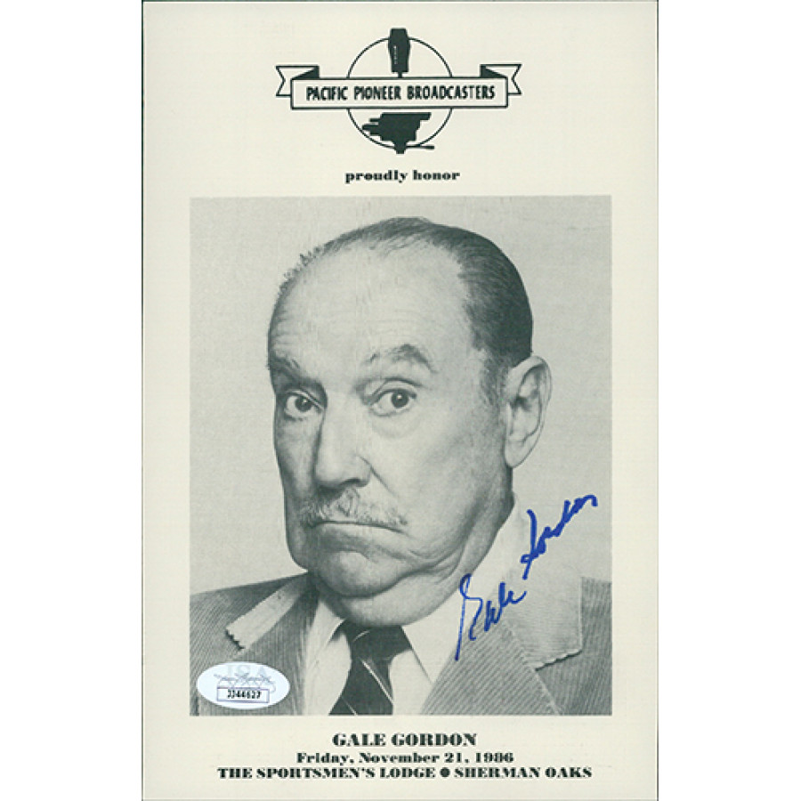 Signed Gale Gordon 5.5x8.5 Pacific Pioneer Broadcasters Promo Flyer in blue ink. This item has been certified by James Spence Authentication (JSA) with sticker affixed to item and matching card.