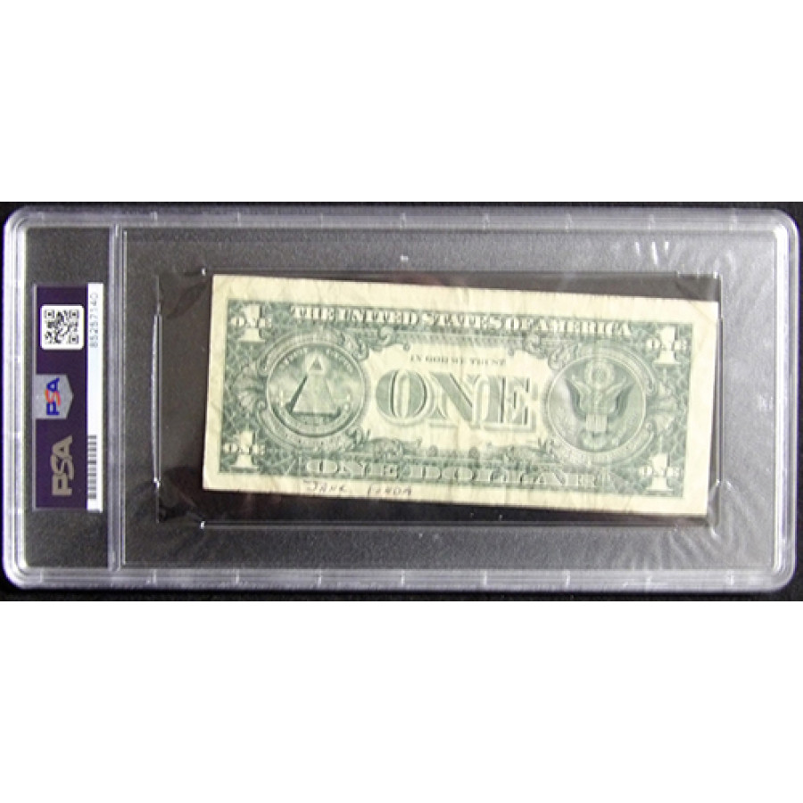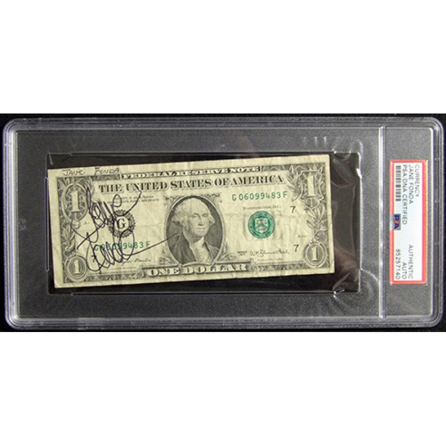Signed Jane Fonda one dollar bill in black ink. This item has been certified by Professional Sports Authenticator (PSA) encapsulated.