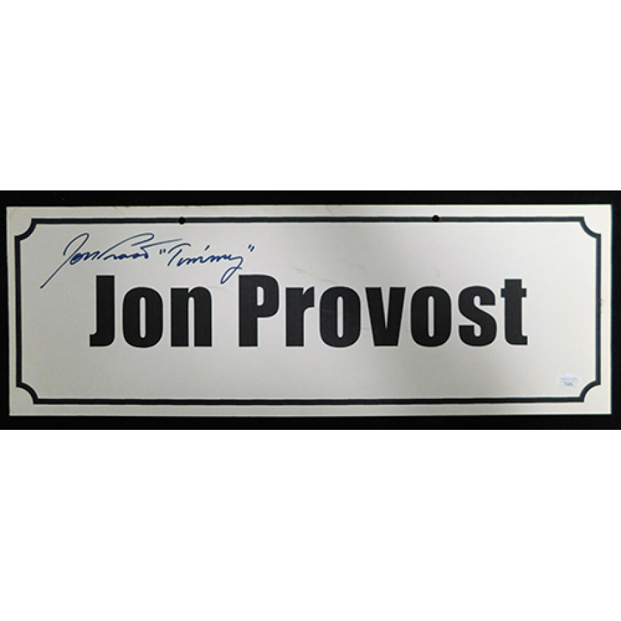 Signed Jon Provost 7x20 name plate sign from the 2005 National in blue sharpie with "Timmy" inscription. The boarders show wearing with dented corners and creases. This item has been certified by James Spence Authentication (JSA) with sticker on item and matching card.