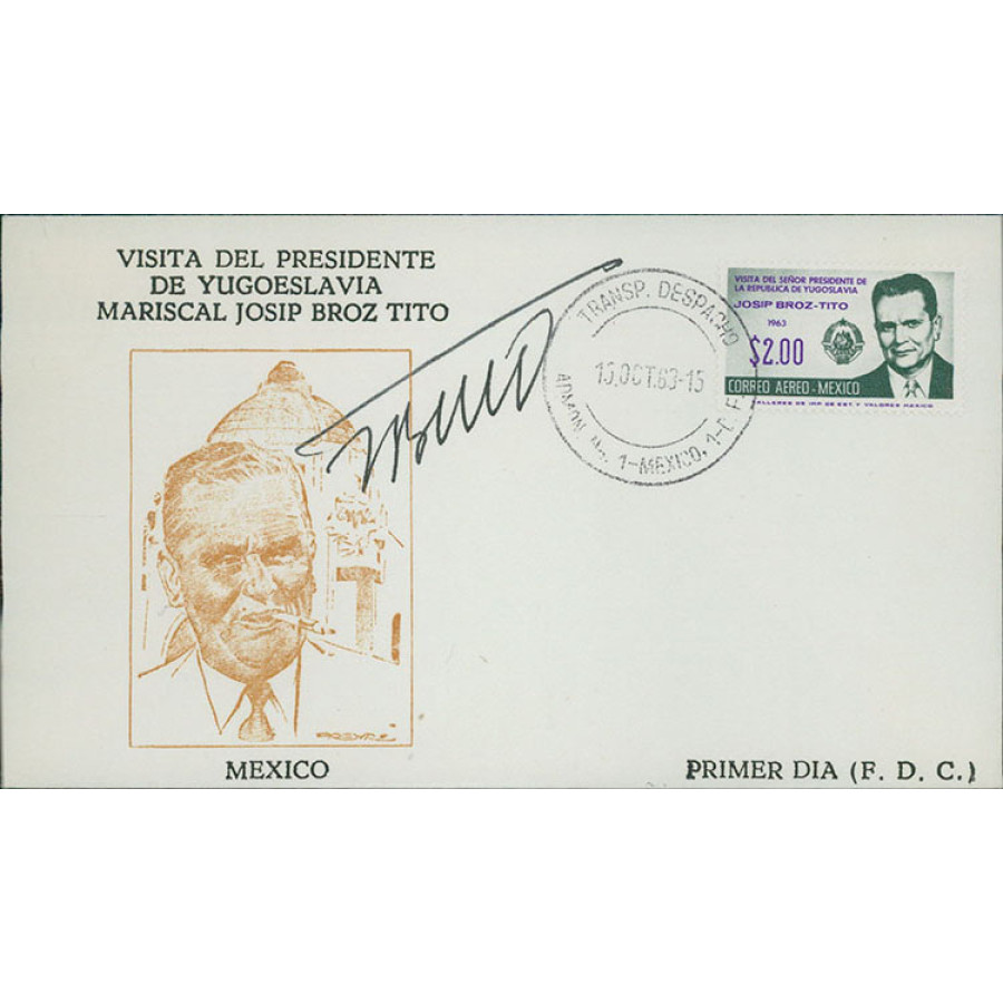 Signed Josip Broz Tito Visita Del Presidente De Yugoslavia Mariscal Josip Broz Tito First Day Issue Cachet Envelope in black ink. This item has been certified by James Spence Authentication (JSA) with sticker affixed to item and matching letter of authenticity.