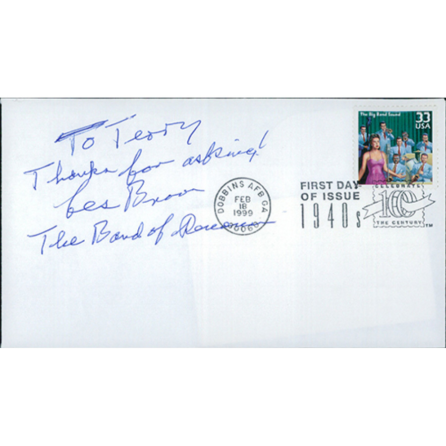 Signed Les Brown 1940s The Big Band Sound Cachet in blue pen personalized. This item has been certified by James Spence Authentication (JSA) with sticker on item and matching card.