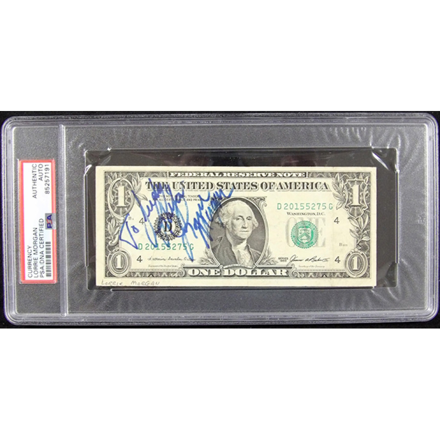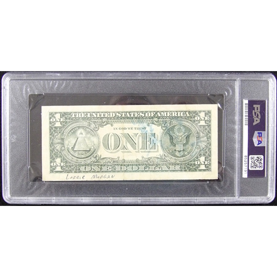 Signed Lorrie Morgan one dollar bill in blue ink personalized. This item has been certified by Professional Sports Authenticator (PSA) encapsulated.