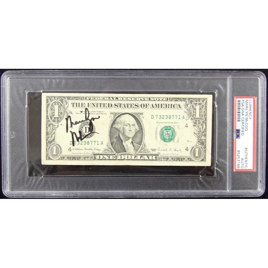 Signed Marilyn McCoo one dollar bill in black sharpie. This item has been certified by Professional Sports Authenticator (PSA) encapsulated.