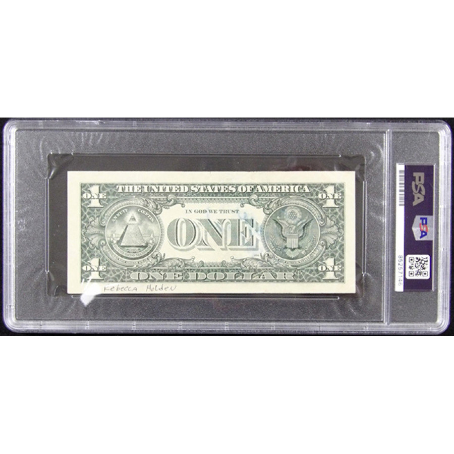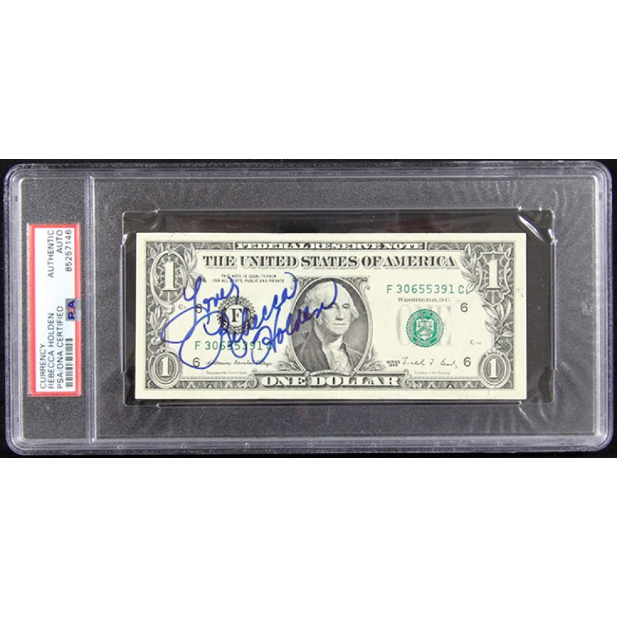 Signed Rebecca Holden one dollar bill in blue sharpie. This item has been certified by Professional Sports Authenticator (PSA) encapsulated.
