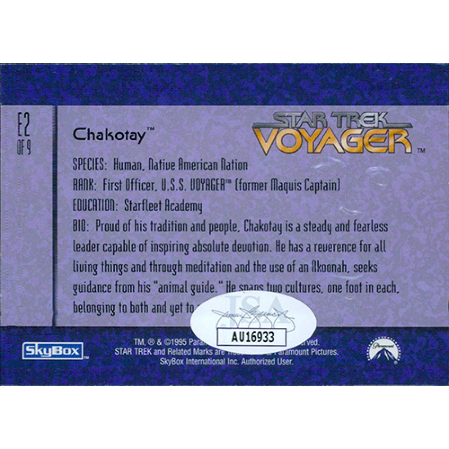 Signed Robert Beltran Star Trek Voyager 1995 Skybox season one series two card #E2 in silver ink. This item is certified by James Spence Authentication (JSA) with sticker affixed to item and matching card.