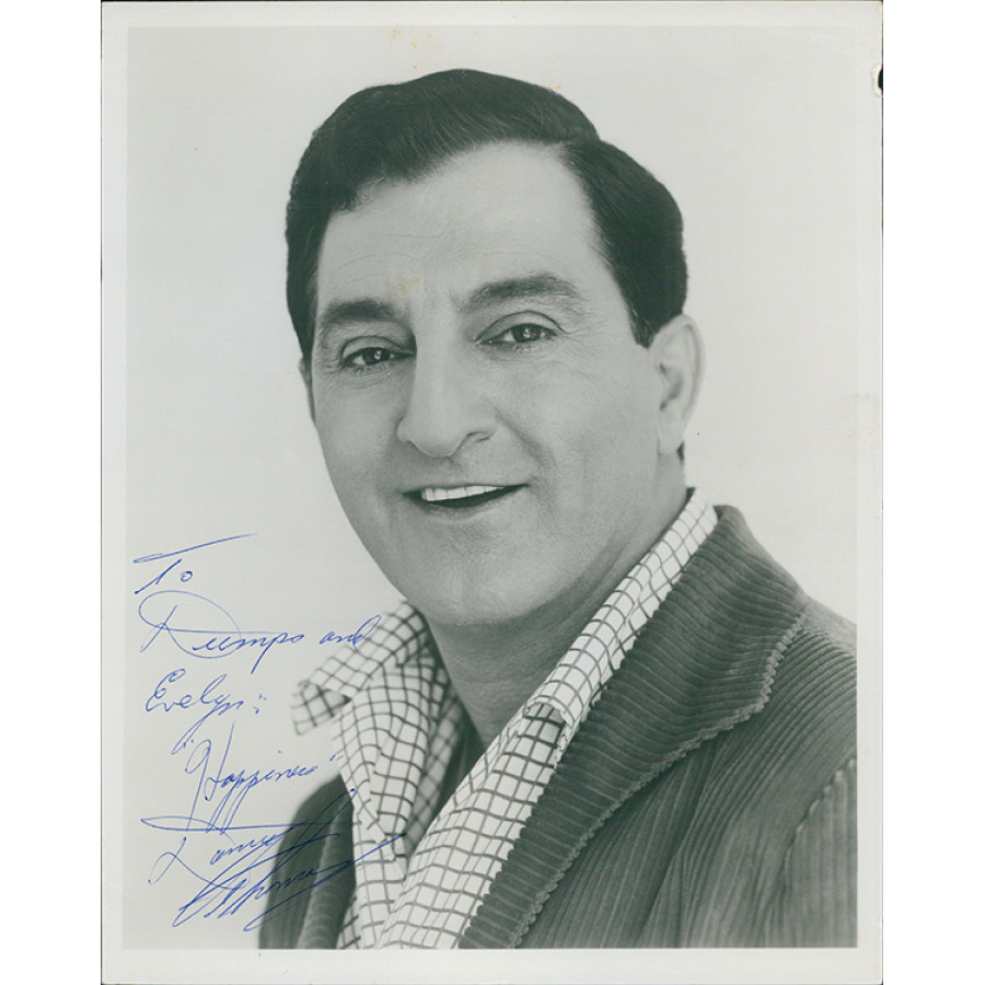 Signed Danny Thomas 8x10 cardstock photo in blue pen personalized "To Dumps and Evelyn Happiness". The photo has some creases in the corners and a indent in the top right side. This item has been certified by James Spence Authentication (JSA) with sticker affixed to item and matching card. This photo comes from the Keely Smith estate and a card is included stating that.