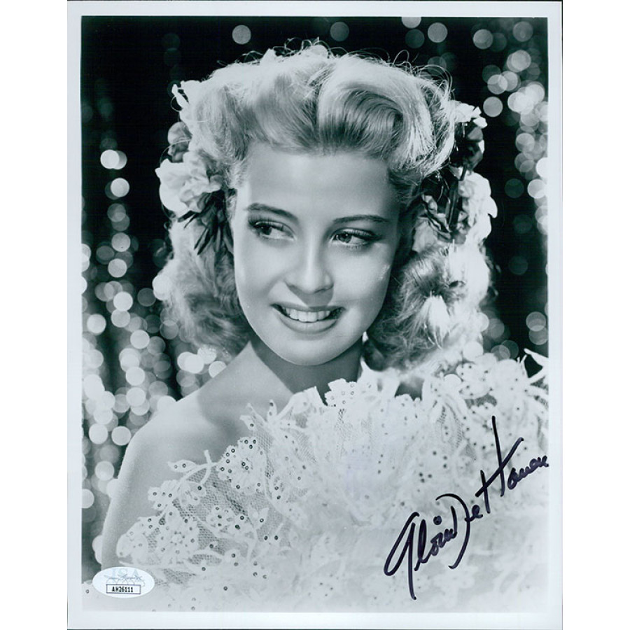 Signed Gloria DeHaven 8x10 glossy finish photo in black sharpie. The photo has some light kinks to it. This item has been certified by James Spence Authentication (JSA) with sticker on item and matching card.