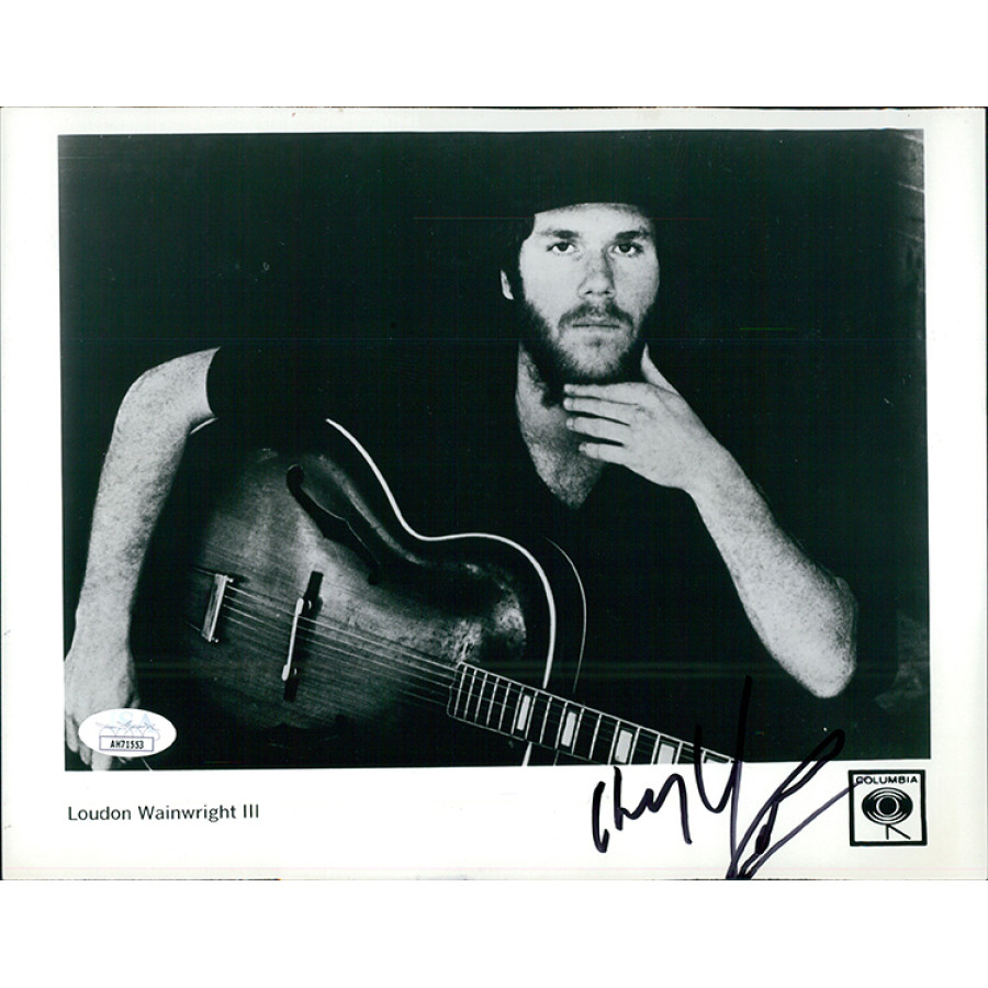 Signed Loudon Wainwright III 8x10 glossy finish promo photo in black sharpie. The photo has kinks and writing impressions. This item has been certified by James Spence Authentication (JSA) with sticker on item and matching card.
